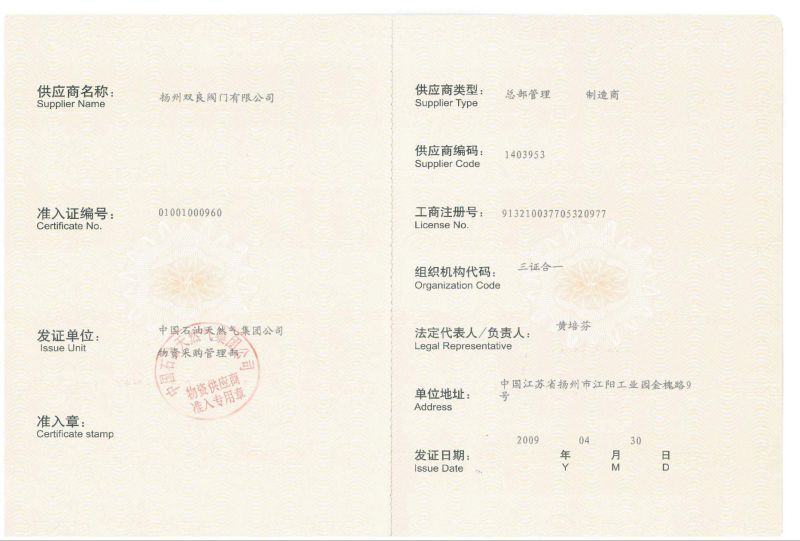 中石油(you)物資供(gong)應商準(zhun)入證書(shu)